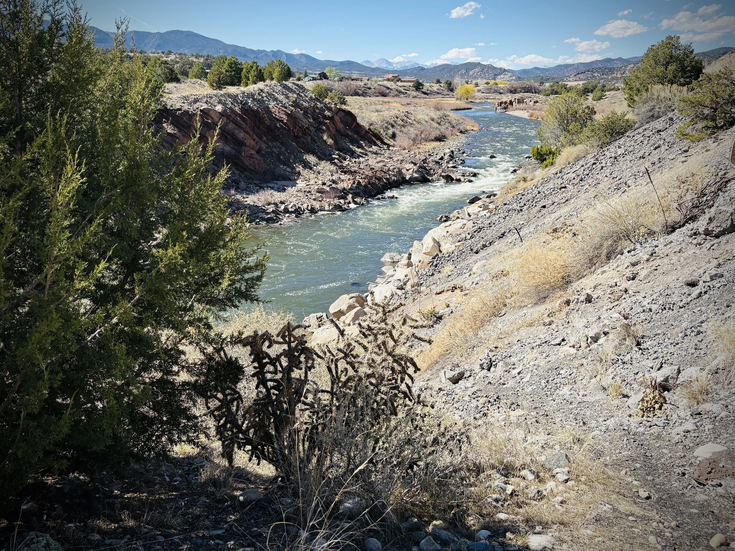 Due to the relatively steep gradient of the Arkansas River, which drops 1000 feet in elevation from Buena Vista to Salida alone, the flows stay pretty swift. Combine that with the contour of a boulder and cobble strewn riverbed our fish have lots of deep cold water refuge. This river is well oxygenated even when you can find high temperatures in the slow shallow water along the edge. So, due to the quality habitat we have here we just plain don’t have the temperature related stress on the fish that you might see in slower gravel/sandy bottom rivers.